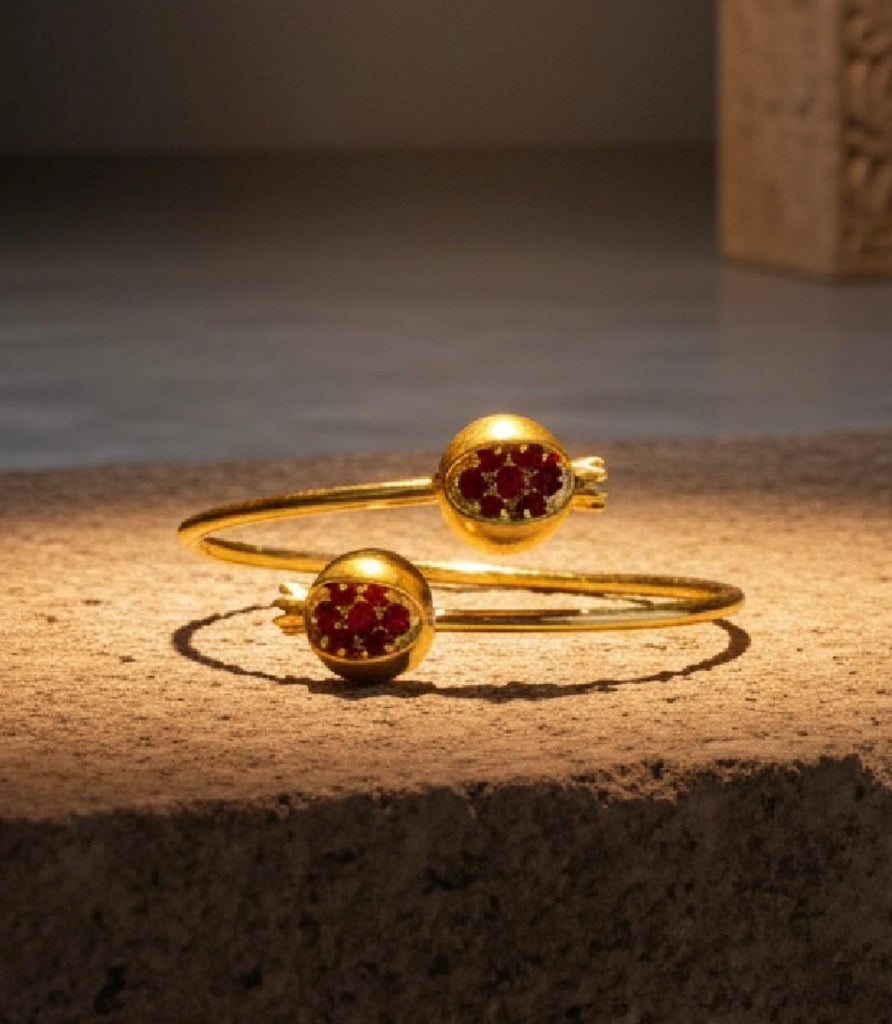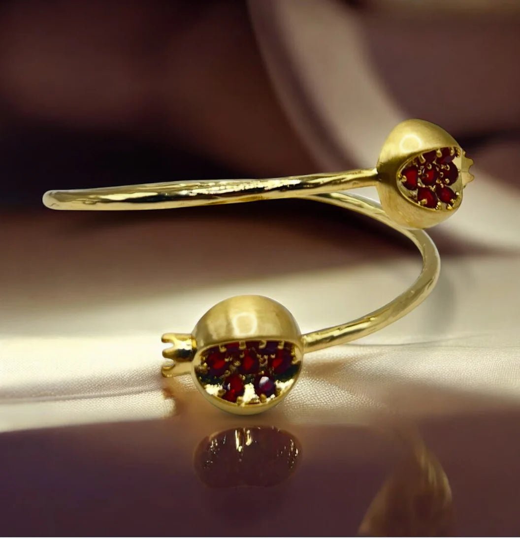 Gracefully designed to symbolize strength and renewal, the Pamela Twig Bracelet from Anet’s Collection features a delicate open-ended design inspired by the natural beauty of a twig. Each end showcases a sculpted pomegranate form — the Armenian emblem of prosperity and life — beautifully accented with shimmering red zircon gemstones that resemble glistening seeds.